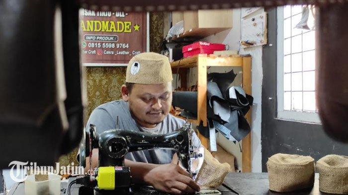 TRIBUNJATIM.COM, BLITAR - Berbekal pengalaman sebagai perajin kulit, Didin Arus Saputro (38) mencoba merambah usaha lain membuat kerajinan peci atau songkok berbahan kain goni bekas.