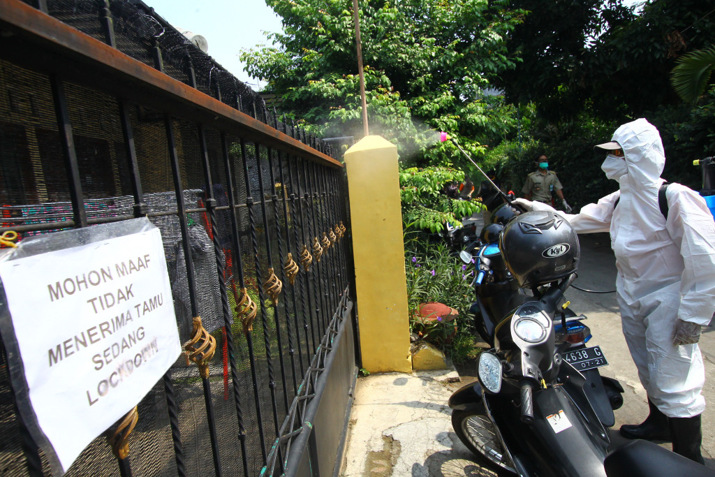 Petugas BPBD Kota Malang langsung menyemprot satu per satu rumah warga di Lowokdoro Gang IV.