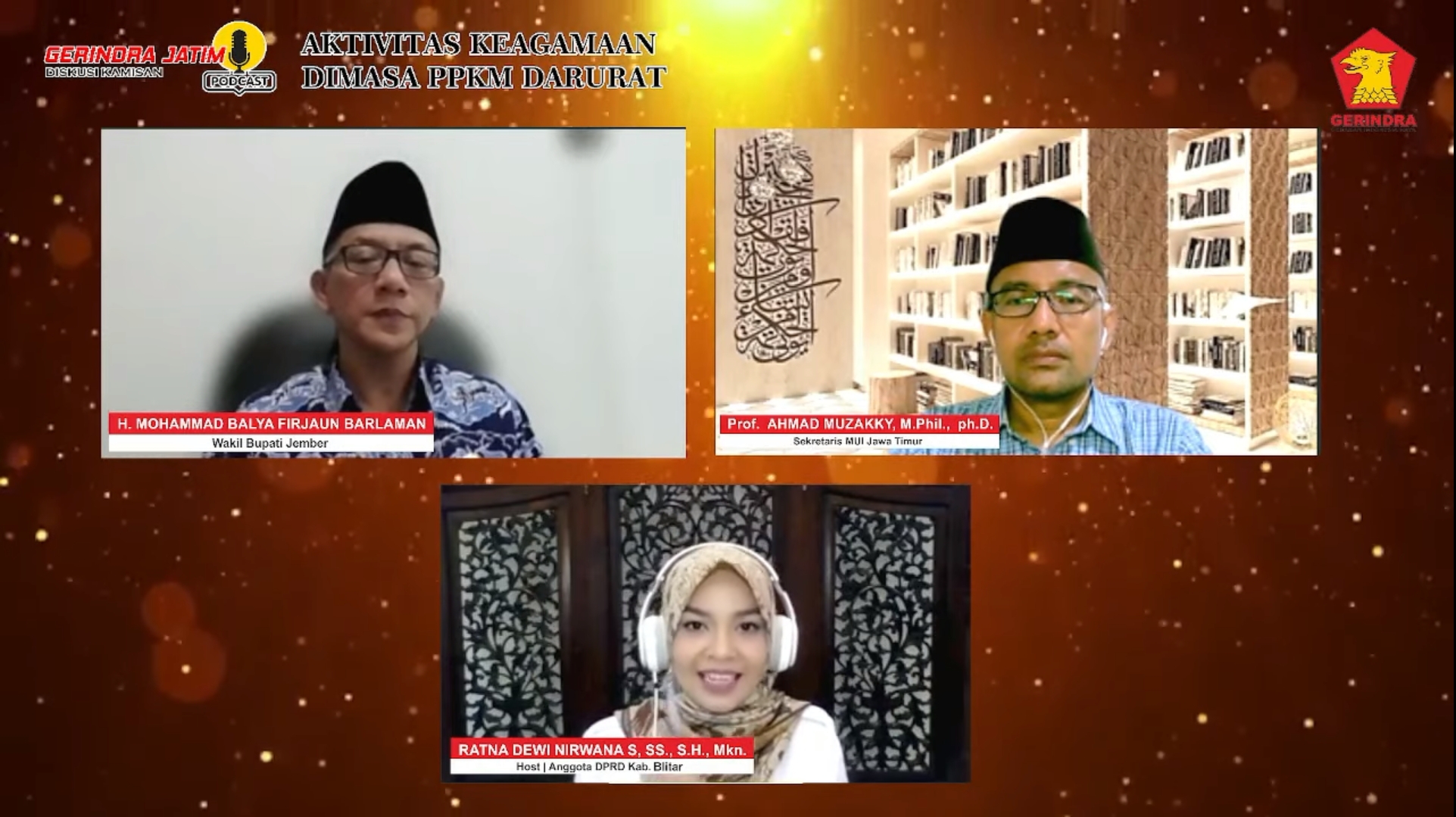 Pembahasan itu mengemuka dalam diskusi kamisan yang diselenggarakan Dewan Pimpinan Daerah (DPD) Partai Gerindra Jawa Timur bertajuk aktivitas keagamaan di masa PPKM Darurat, Kamis (22/7/2021).