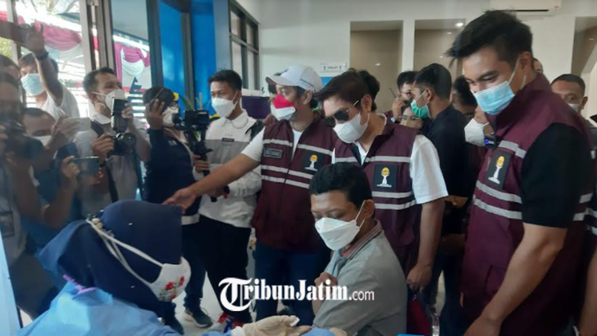 TRIBUNJATIM.COM, GRESIK - Sebanyak 10 ribu dosis vaksin diberikan kepada masyarakat Gresik yang berada di wilayah pesisir. Vaksinasi yang digelar oleh Himpunan Pengusaha Muda Indonesia (Hipmi) itu turut dihadiri artis ibukota, Baim Wong.