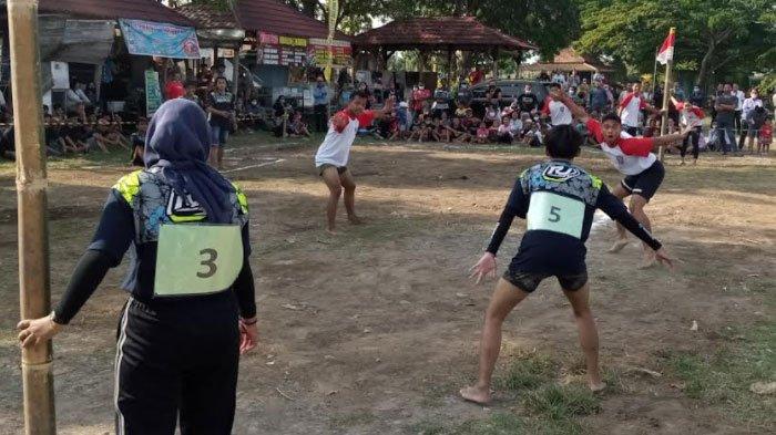TRIBUNJATIM.COM, TULUNGAGUNG - Sorak sorai penonton mengiringi dua tim betengan yang sedang bertanding di lapangan Wisata Kuliner Balung Kawuk Desa Sumberejo Kulon, Kecamatan Ngunut, Rabu (20/10/2021).