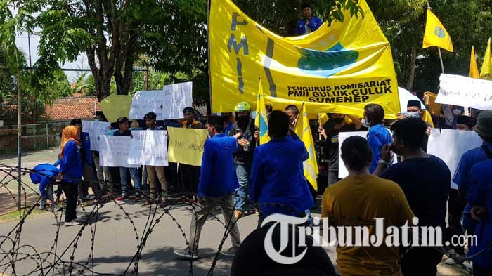 TRIBUNJATIM.COM, SUMENEP - Pergerakan Mahasiswa Islam Indonesia (PMII) Sumenep menggelar aksi unjuk rasa di depan kantor PT Garam (Persero) Kalianget, Rabu (10/11/2021) sekitar pukul 10.09 WIB.