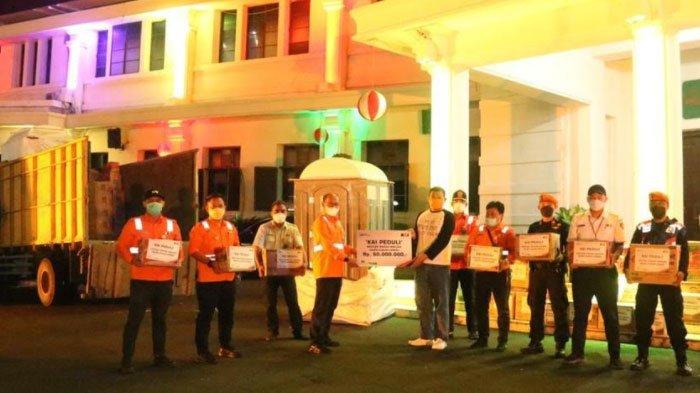 PT Kereta Api Indonesia (KAI) Persero menyerahkan bantuan 3 toilet portable dan beberapa paket sembako kepada BPBD Kota Malang, Minggu (5/12/2021).