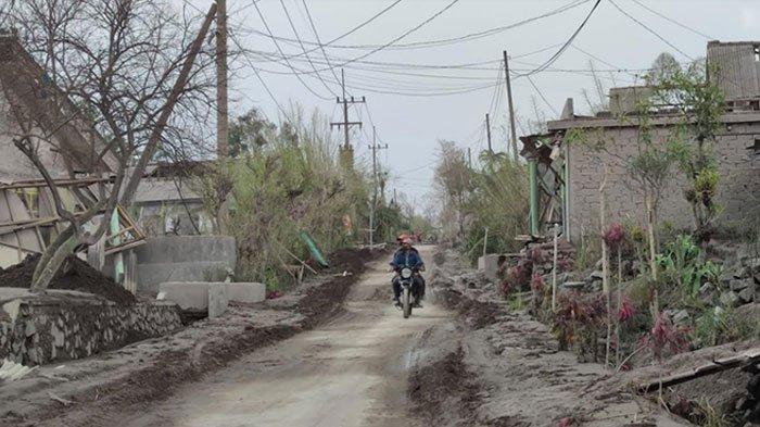 Kondisi jalan dan rumah warga Dusun Curah Kobokan. Jalan berlumpur dan rumah lulu lantak dihempas awan panas, Senin (6/12/2021).