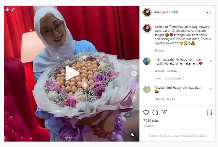 Hal itu terlihat saat dia merayakan ulang tahun pada bulan Maret 2021. Datin Red memamerkan kiriman bunga dan kue dari Adira.