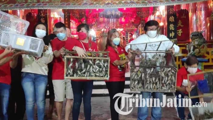 TRIBUNJATIM.COM, TUBAN - Selain sembahyang pada pergantian Tahun Baru Imlek ke 2573, Tempat Ibadah Tri Dharma (TITD) Kwan Sing Bio Tuban juga melakukan ritual lepas burung di halaman klenteng, Senin (31/1/2022) malam.