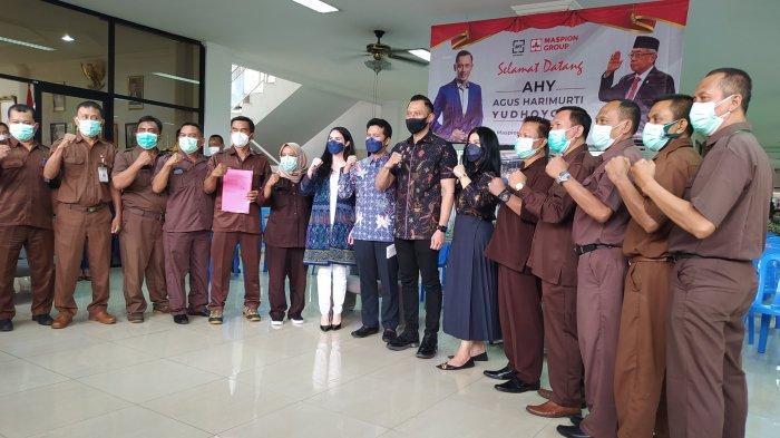 TRIBUNJATIM.COM, SURABAYA - Ketua Umum Partai Demokrat Agus Harimurti Yudhoyono (AHY) bertemu dengan serikat buruh saat berkunjung ke Maspion di Gedangan Sidoarjo, Sabtu (19/2/2022). Dalam kesempatan ini, AHY mendapatkan harapan agar mendorong Menteri Tenaga Kerja (Menaker) mencabut aturan jaminan hari tua (JHT) diambil di usia 56 tahun.