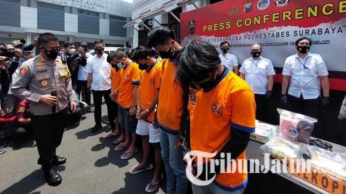 Bekuk lima pria kurir narkoba jaringan lapas, Satresnarkoba Polrestabes Surabaya berhasil mengamankan total 46,6 kilogram sabu.