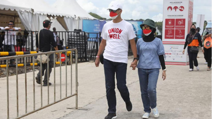 Gubernur Jawa Tengah Ganjar Pranowo menghadiri GP Mandalika hari kedua, Sabtu (19/3/2022). Ganjar yang menggandeng isterinya, Siti Atikoh, berbaur ber