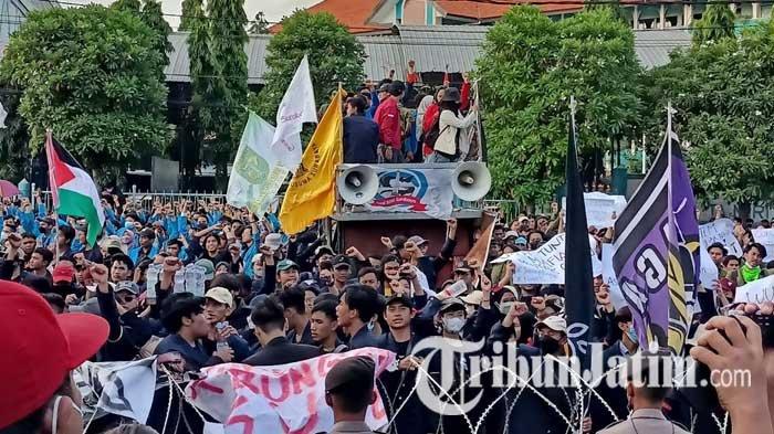 TRIBUNJATIM.COM, SURABAYA - Massa dari mahasiswa di Surabaya menggelar aksi demonstrasi di depan Gedung DPRD Jawa Timur, Kamis (14/4/2022).