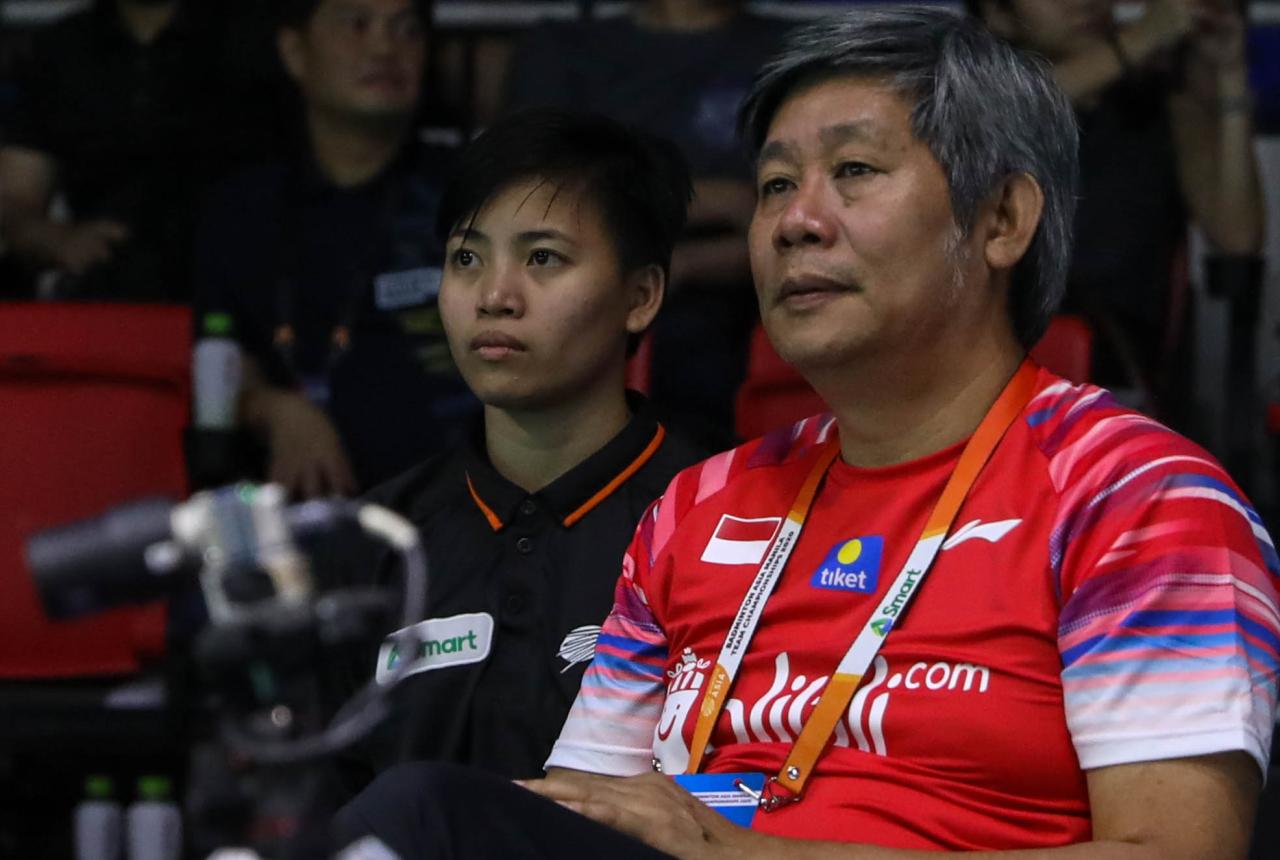 Herry IP mendengar pernyataan Fajar Alfian yang cedera pinggang karena menerima servis dari Hoki/Kobayashi.
