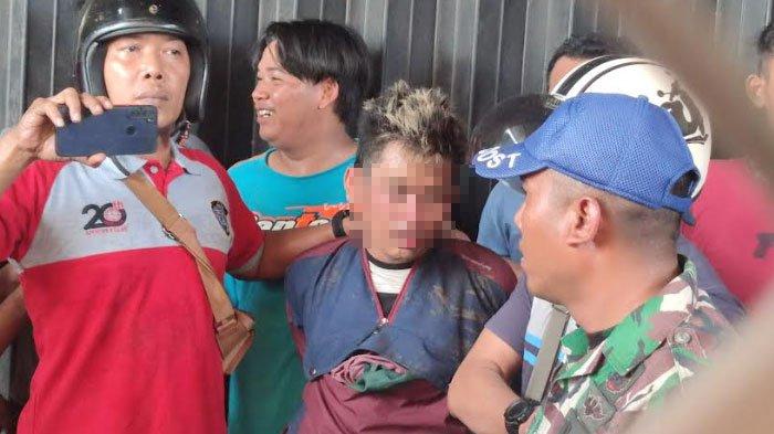 Pelaku saat diamankan dari amukan warga usai tepergok mencuri motor di toko plastik setempat, Selasa (12/7/2022).