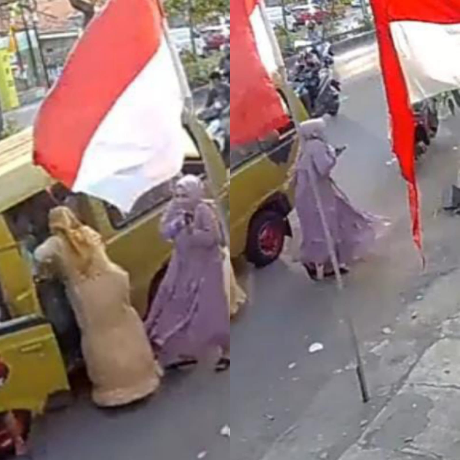 Pelaku mulai melajukan motornya perlahan mendekati salah seorang emak-emak berpakaian busana muslimah warna ungu yang berdiri mengantre paling akhir di depan pintu mobil mikrolet.
