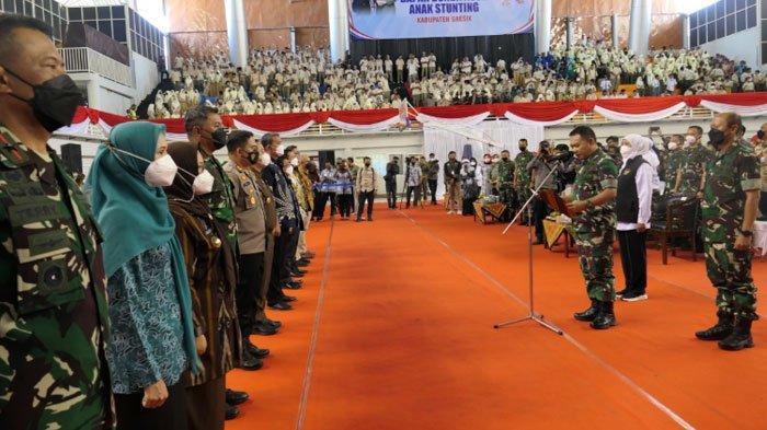 TRIBUNJATIM.COM, GRESIK - Kepala Staf Angkatan Darat (KASAD) Jenderal TNI Dudung Abdurachman, disaksikan Gubernur Jawa Timur, Khofifah Indar Parawansa mengukuhkan sejumlah pejabat dan tokoh masyarakat Gresik sebagai Bapak dan Bunda Asuh Anak Stunting, Kamis (01/09).