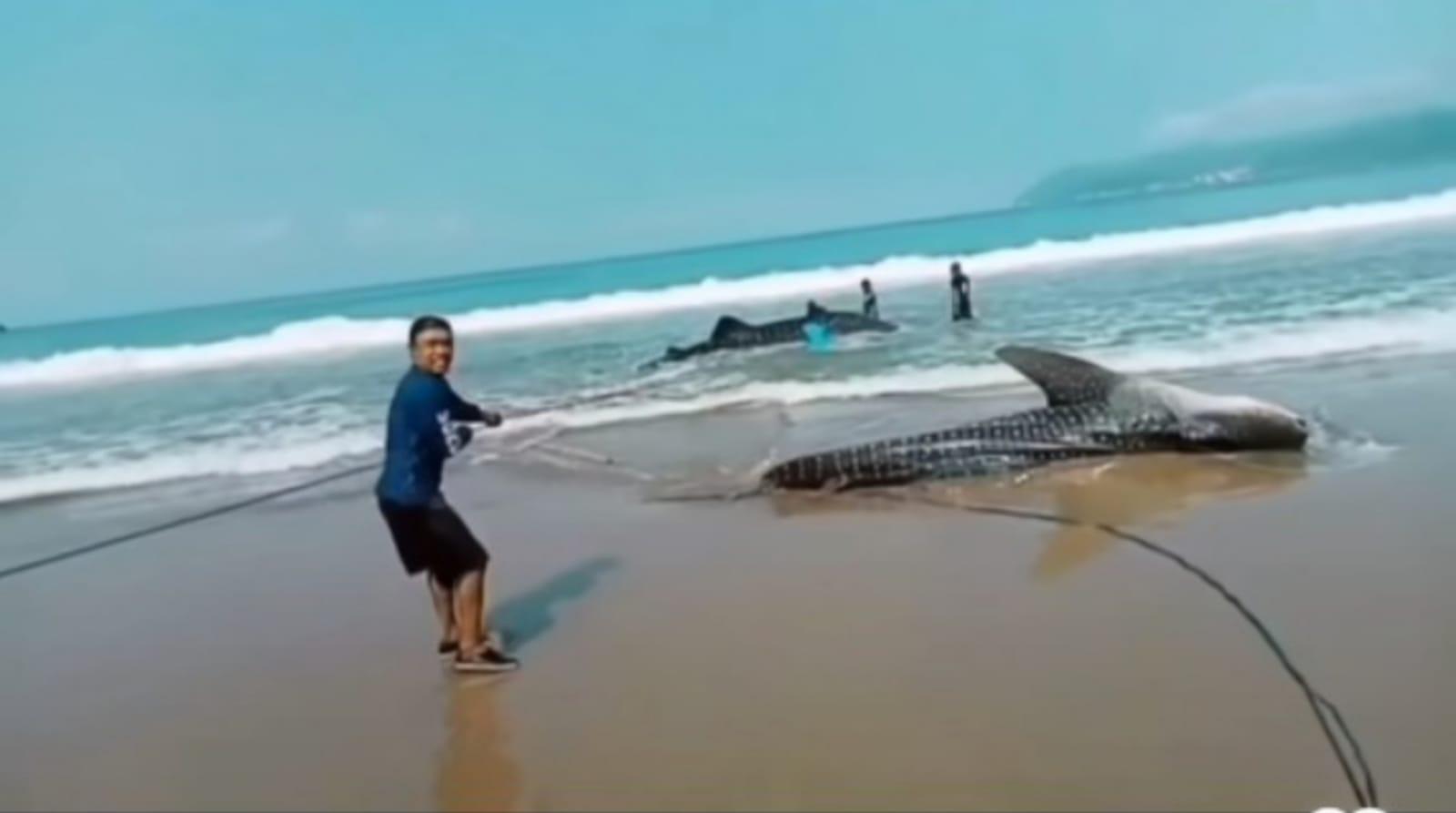 Kondisinya diketahui 1 ekor sudah tergeletak di daratan pasir pantai, sedangkan satu ekor lagi sebagian badannya masih terendam air laut. Sejumlah nelayan dan warga berdatangan ke lokasi dan berupaya memberikan pertolongan dengan menarik ikan Hiu menuju darat.