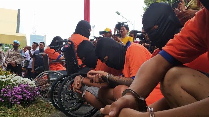 TRIBUNJATIM.COM, SURABAYA-Dua dari 11 orang tersangka pembuatan uang palsu (Upal) yang berproduksi di Bandung Barat, Jabar, terpaksa duduk di atas kursi roda saat menjalani konferensi pers di halaman Mapolda Jatim, Kamis (3/11/2022) siang.