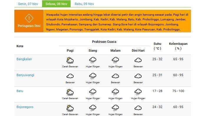 TRIBUNJATIM.COM - Bagi Anda yang akan beraktivitas di luar rumah Selasa, 8 November 2022 agaknya perlu memperhatikan cuaca Jatim.
