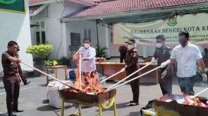 TRIBUNJATIM.COM, KEDIRI - Barang bukti narkotika, minuman keras dan obat keras dimusnahkan dengan cara dibakar di halaman Kantor Kejaksaan Negeri Kota Kediri, Rabu (23/11/2022).