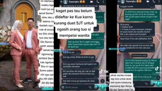 Tak hanya itu, pihak keluarga wanita juga meminta uang lagi dengan rincian Rp1,2 juta untuk mendaftar dan mengurus buku nikah di KUA, Rp1,5 juta untuk beli ayam kampung sepasang, dan Rp700 ribu untuk sewa antaran.
