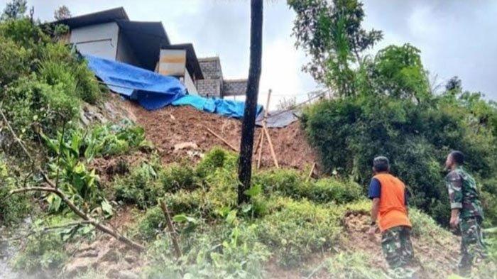 Di desa yang sama, sebuah rumah dihantam longsoran tebing setinggi empat meter dengan panjang lima meter hingga membuat tembok jebol.