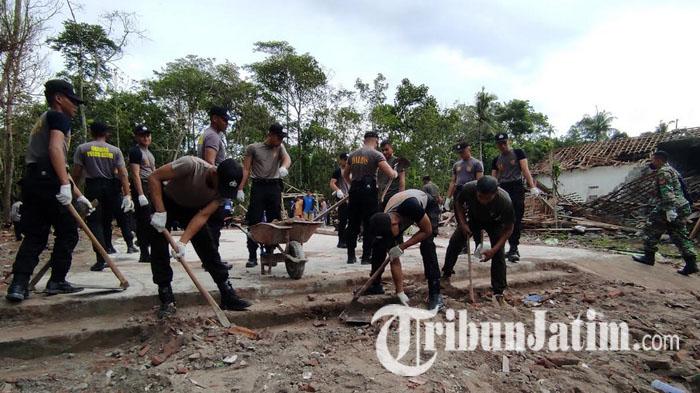 TRIBUNJATIM.COM, BLITAR - Petugas gabungan dari Polres Blitar Kota, Kodim 0808/Blitar, Badan Penanggulangan Bencana Daerah (BPBD) dan relawan kerja bakti membersihkan reruntuhan material bangunan di lokasi pusat ledakan bahan petasan di Dusun Tegalrejo Sadeng, Desa Karangbendo, Kecamatan Ponggok, Kabupaten Blitar, Jawa Timur, Jumat (24/2/2023).
