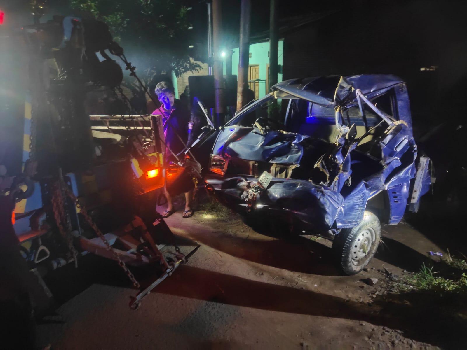 Pikap yang saat itu tengah mengangkut empat orang anggota keluarga tiba-tiba macet saat melintasi rel kereta sekitar pukul 21.45 WIB.