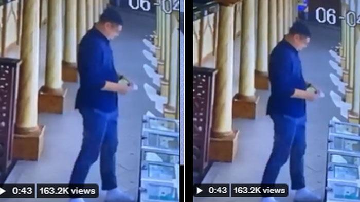 Pria yang memakai kemeja lengan panjang dan celana panjang itu celingak-celinguk sebelum melancarkan aksinya.