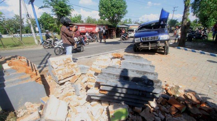 Mobil berwarna biru itu menabrak tiang apill (Alat Pemberi Isyarat Lalu Lintas) dan Tugu hingga terbalik.