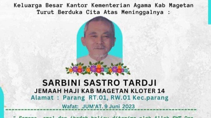 Kementerian Agama (Kemenag) Kabupaten Magetan menyampaikan kabar duka. Seorang jamaah haji asal Magetan bernama Sarbini Sastro Tardji tutup usia di Ta