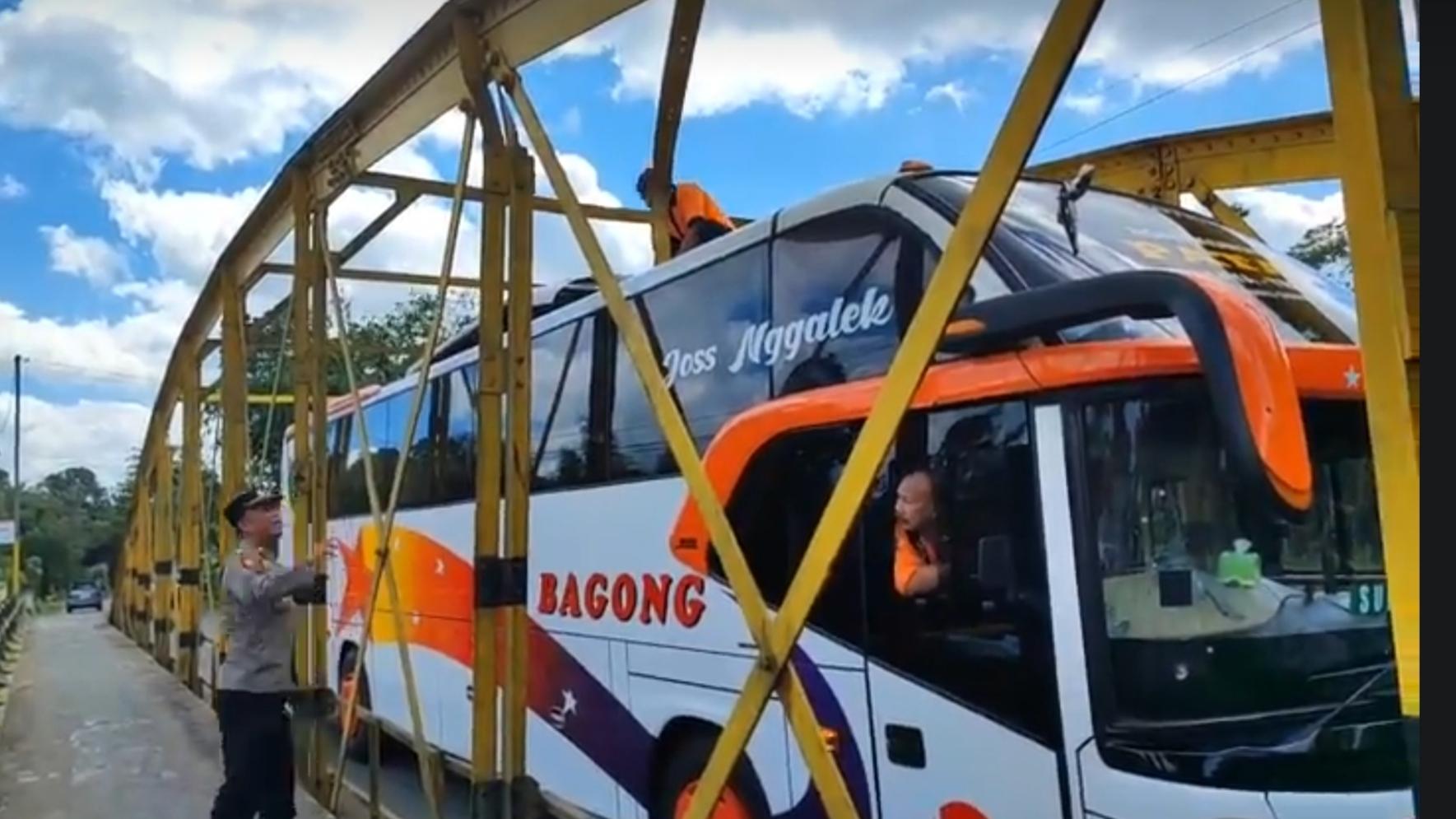 TRIBUNJATIM.COM, TRENGGALEK - Bus Bagong jurusan Trenggalek-Surabaya tersangkut di jembatan besi Desa Bendorejo, Kecamatan Pogalan, Kabupaten Trenggalek, Rabu (12/7/2023).