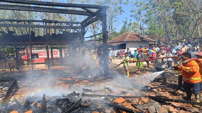 Dari ledakan itu lalu keluar api yang secara perlahan membakar bangunan rumah 3 lokal yang terbuat dari kayu.
