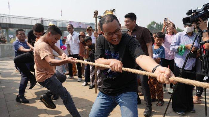 Pada hari ini, Anies mengikut dua lomba yang digelar di area Waduk Lebak Bulus yaitu tarik tambang yang menjadi favoritnya dan gebuk bantal.