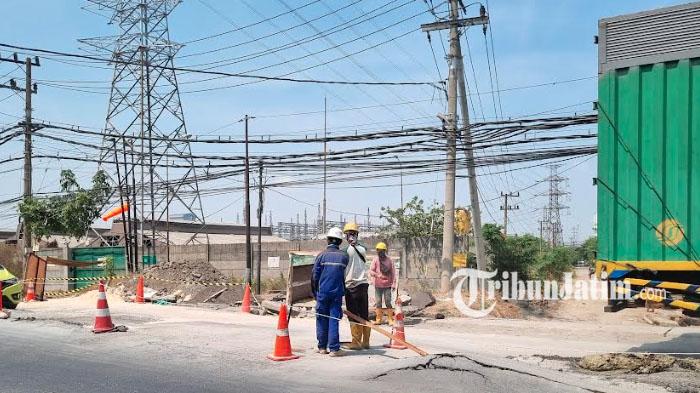TRIBUNJATIM.COM, GRESIK - Jalan Raya Sukomulyo, Manyar yang menggelembung disebut karena aktivitas pipa PLN.