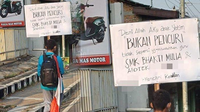 "Demi Allah aku anak yatim 'Bukan Pencuri' tidak seperti yang dituduhkan guru SMK Bhakti Mulia dan apotek (tempat magang). Mencari keadilan," bunyi tulisan dalam poster itu.