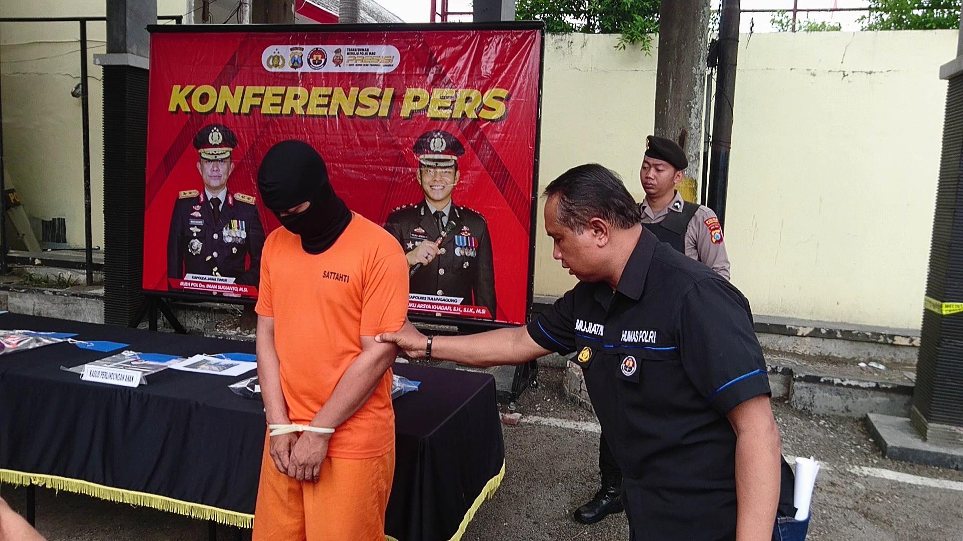 TRIBUNJATIM.COM, TULUNGAGUNG - DAR (25) tertunduk saat dikaal petugas ke lokasi konferensi pers di Polres Tulungagung, Sabtu (25/11/2023).