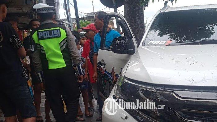 TRIBUNJATIM.COM, JEMBER - Mobil Pajero Sport warna putih melaju dengan kecepatan pelan dan menabrak Toko Jamu Restu Ibu di Jalan Sultan Agung Jember, Jawa Timur, Jumat (15/12/2023).