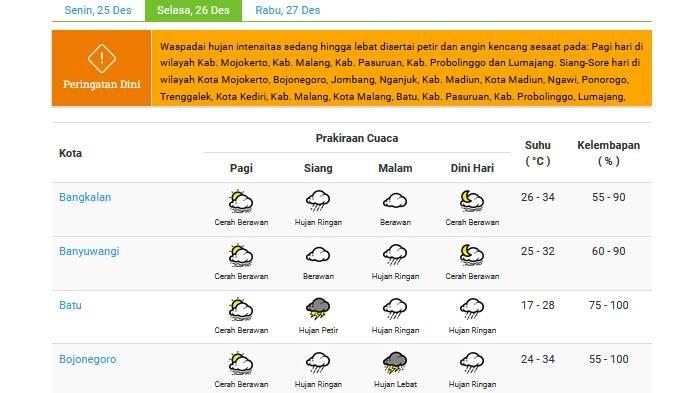 Simak prakiraan cuaca Jatim besok Selasa 26 Desember 2023. Hujan petir akan melanda Batu, Kota Kediri, dan Trenggalek pada siang hari.