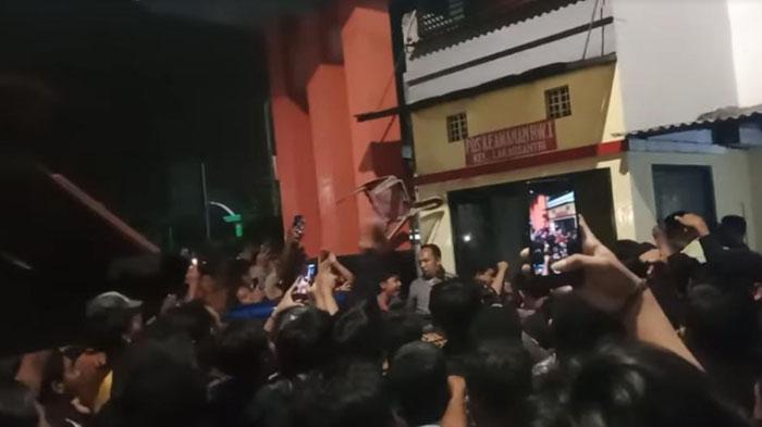 Bahkan tampak juga beberapa orang lainnya melemparkan benda seperti kursi berbahan plastik ke tengah pusat kerumunan tersebut.