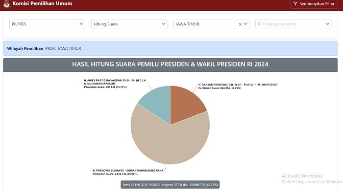 Berikut update terkini real count KPU hari ini, 15 Februari 2024 pukul 15.30 WIB. Prabowo Subianto sapu bersih suara di Jatim, hanya sisakan Pamekasan