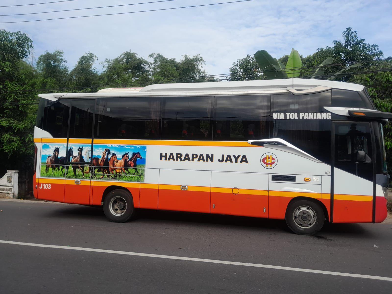 Posisi Bus Harapan Jaya berada di belakang pengendara sepeda motor.