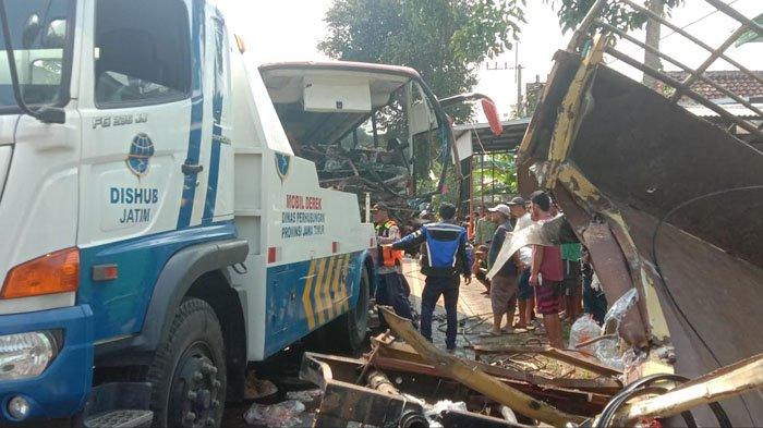 Diduga mengalami rem blong, bus di Kecamatan Singosari Kabupaten Malang menyeruduk 4 rumah, satu sepeda motor, dan satu truk, Rabu (20/3/2024) siang.