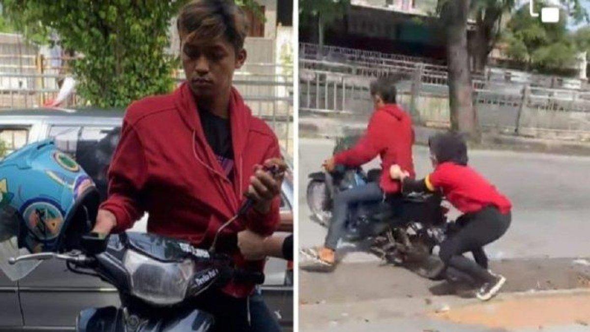 Kasir minimarket sempat terseret sekian meter akibat mencoba menahan motor dengan cara menarik behel atau rear grip motor.