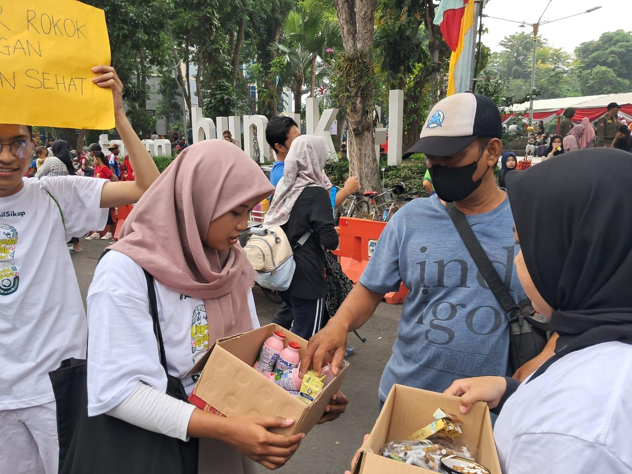 TRIBUNJATIM.COM, SURABAYA - Mahasiswa dari Research Group Tobacco Control (RGTC), Fakultas Kesehatan Masyarakat Universitas Airlangga (FKM Unair) mengajak pengunjung Car Free Day Taman Bungkul untuk menukar satu batang rokok dengan susu, Minggu (9/6/2024).