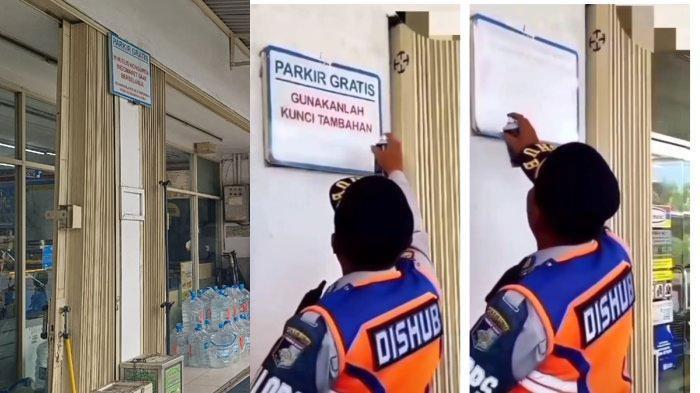 TRIBUNJATIM.COM - Sebuah potongan video menunjukkan seorang petugas Dinas Perhubungan (Dishub) sedang menghapus tanda 'Parkir Gratis' di sebuah minimarket.