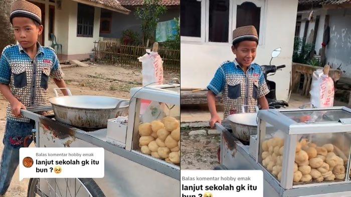 Dalam video tersebut tampak seorang bocah yang sedang berhenti sembari membawa gerobak lengkap dengan panci penggorengan.