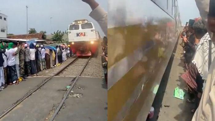 Dalam video tersebut, nampak para jajaran jemaah yang berdiri begitu dekat dengan rel kereta api.