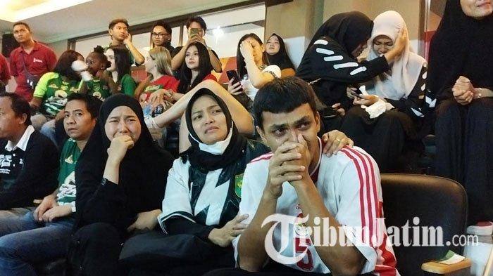 Rachmat Irianto tak kuasa menahan tangis saat saksikan vide Tribute to Almarhum Bejo Sugiantoro di GBT, jelang laga Persebaya vs Persib Bandung.