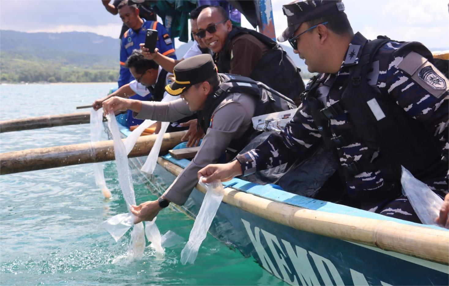 Pihak kepolisian dan yang terkait membebaskan lepaskan 27 ribu benih lobster ke telur Pacitan.