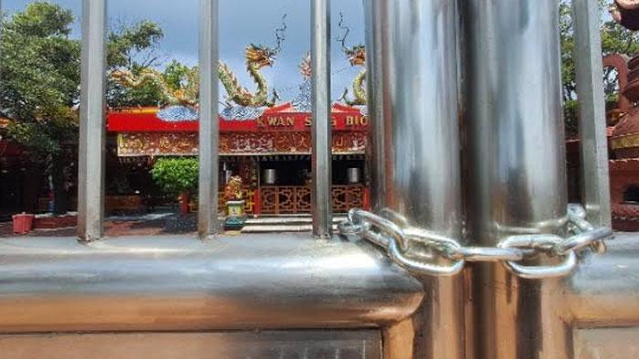 Dari pantauan di lapangan, sejak Senin (9/6/2025) malam, gerbang Klenteng Kwan Sing Bio terlihat terkunci rapat dengan rantai mengikat pagar. Selain itu tampak area TITD Kwan Sing Bio juga dalam kondisi gelap gulita.