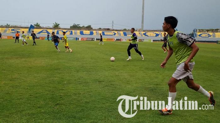 Para pemain unjuk kebolehan di hadapan tim pelatih di Stadion Gelora Joko Samudro Gresik, pada Selasa (5/8/2025) sore.